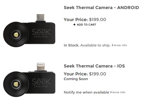 Who says you can’t make low-cost high-tech products in the US? “SEEK THERMAL” says they can for under $200! The only competitor that I know of in the sub $500 thermal camera category is FLIR’s “flir one” currently at $250 ($350 MSRP).
