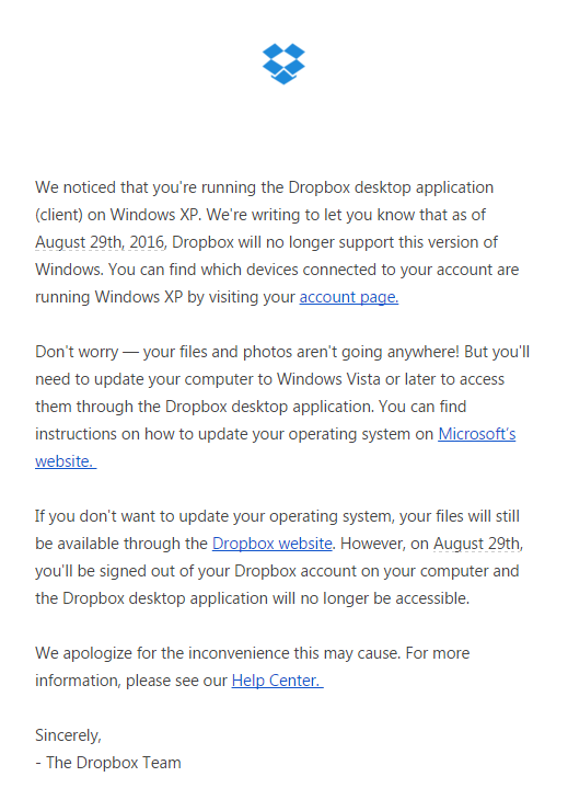 2 Responses to “4/19/2016: Dropbox officially ends support for Windows XP systems as of 8/29/2016.”